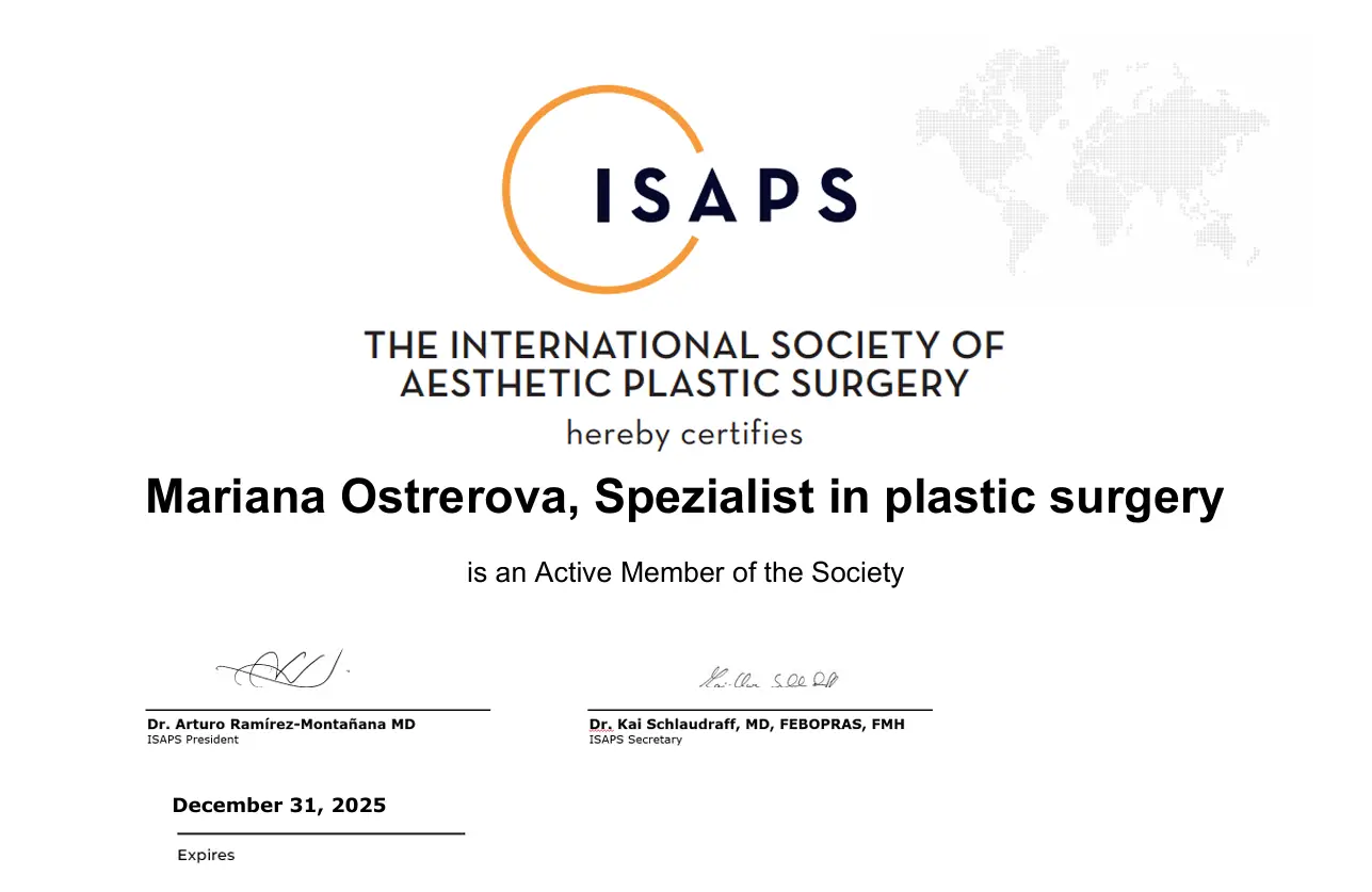 As a specialist in plastic and aesthetic surgery, she performs both surgical and conservative treatments. One of her strengths is in the overall assessment and counseling of patients to achieve a flawless outcome. This is the reason why you can expect the highest level of service from Dr. Ostrerova. Besides German, she is fluent in Spanish, Russian, English and Turkish.